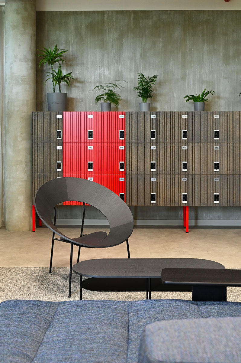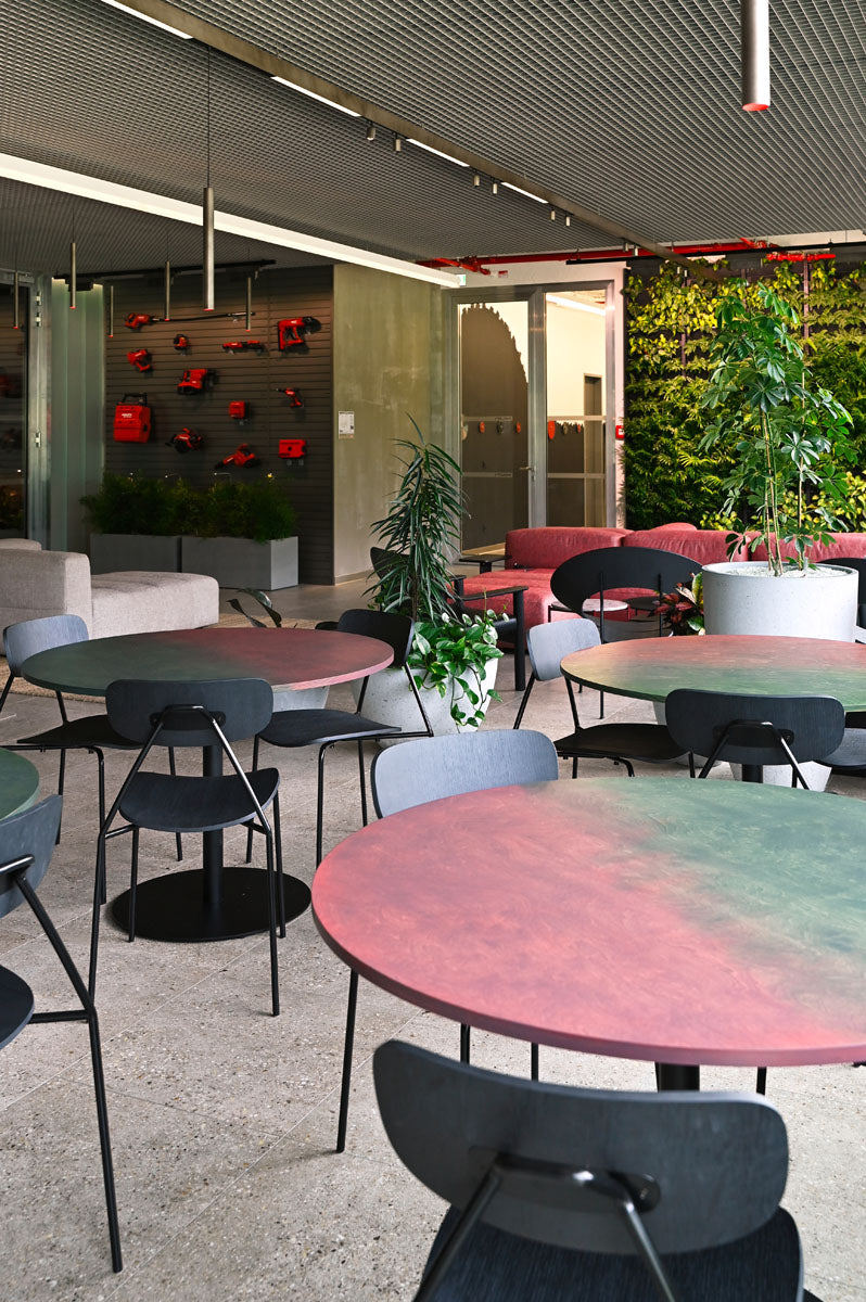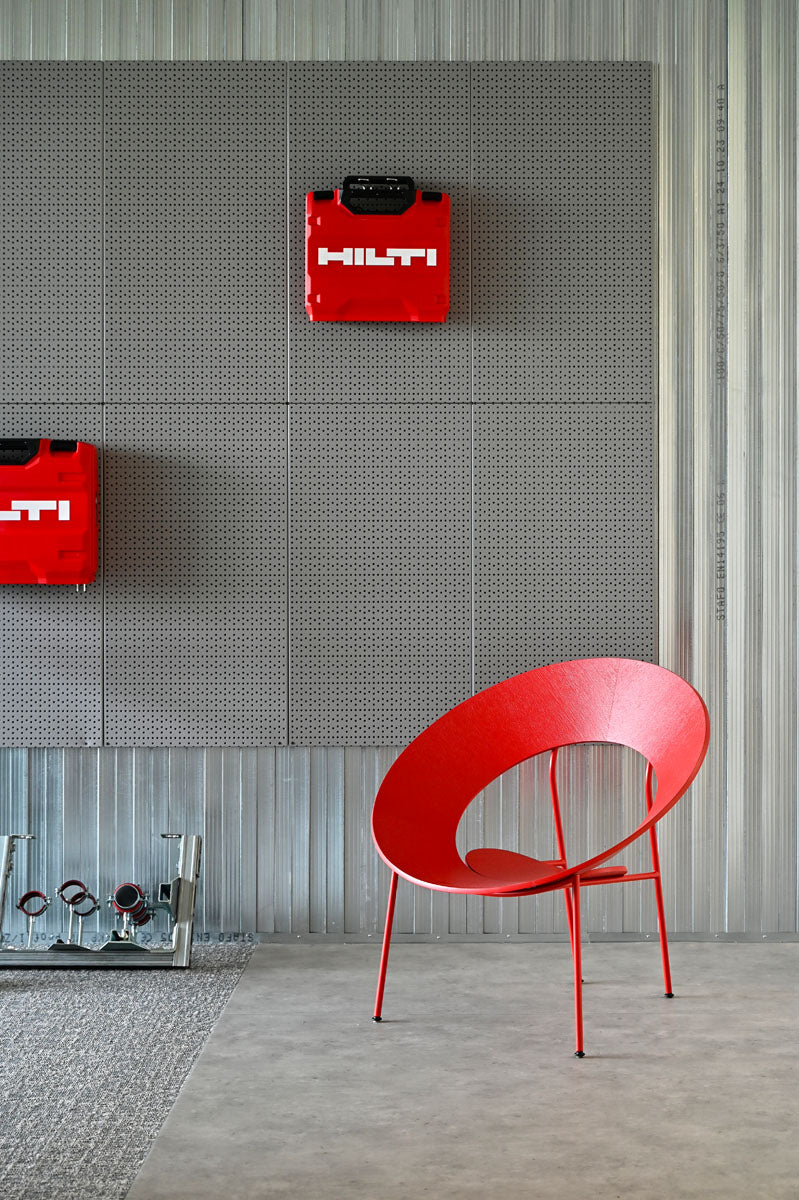 Prostory jsme obohatili o židle a barovky z kolekce Mistra v elegantní černé variantě (24 ks), stoličky UM Stool (7 ks) a 19 křesílek Cocon, z nichž 4 kusy jsou v červené barvě, signifikantní pro značku a výrobky Hilti. Atmosféru dotváří stolky Cocon (11 ks) a několik policových systémů Shelf One (17 ks). V prostoru kanceláří také slouží praktické věšáky Spaghetti (14 ks).