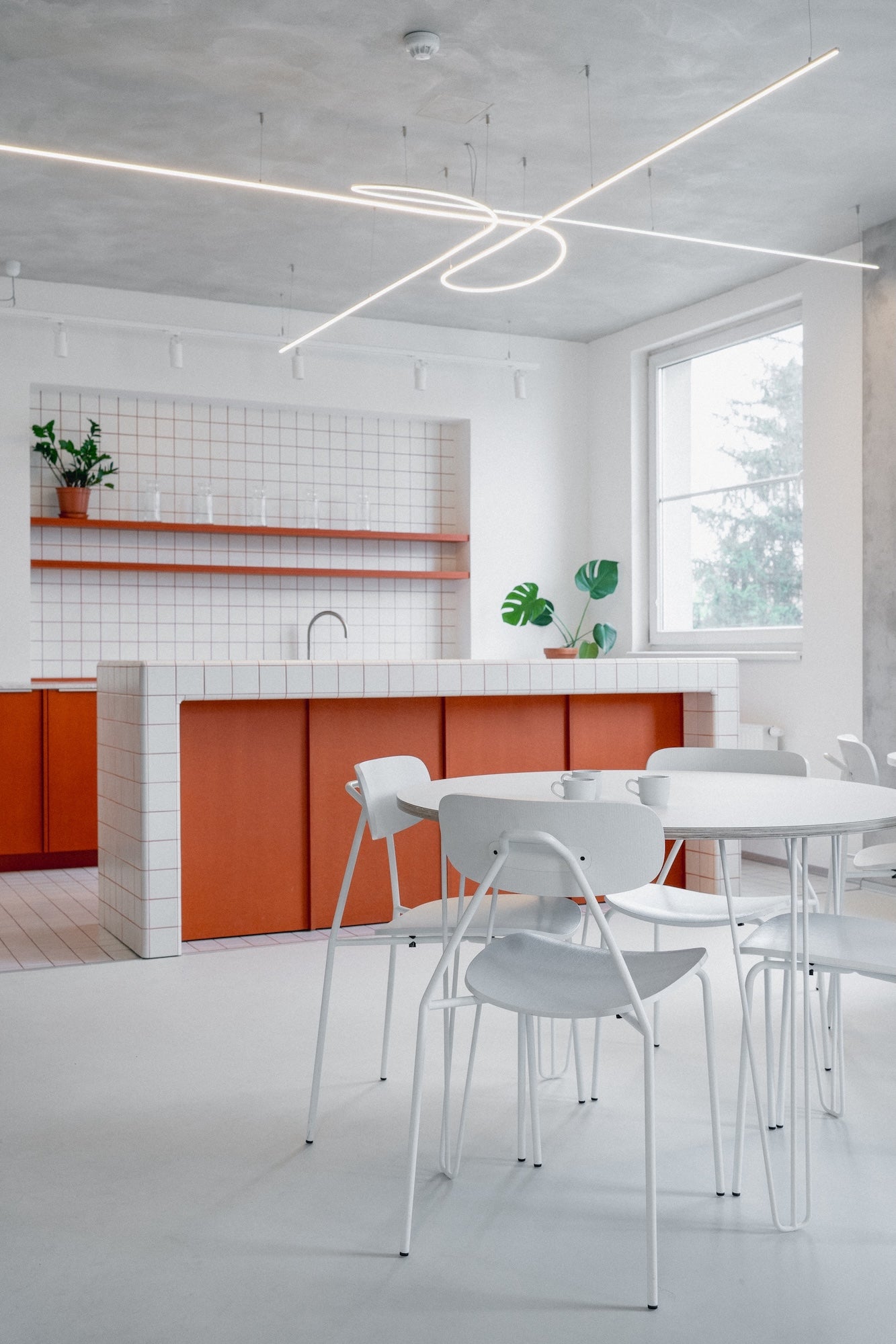 Nový interiér propojuje firemní identitu se zachováním původního charakteru objektu. Dominují mu odstíny modré a oranžové, doplněné o nerez a beton. Vzniklo tak moderní, přívětivé pracovní prostředí. Jsme rádi, že naše produkty do tohoto architektonického konceptu přirozeně zapadly.